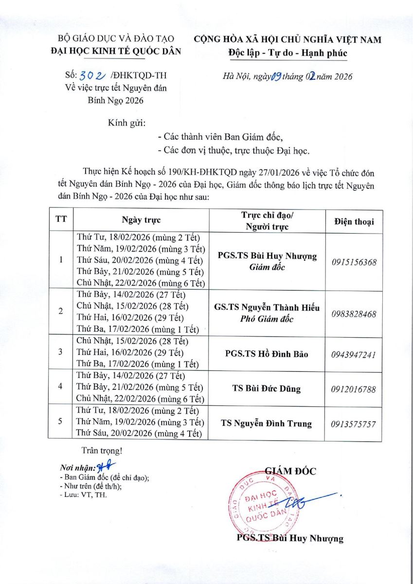 Thông báo Số: 302/ĐHKTQD-TH V/v trực tết Nguyên đán Bính Ngọ 2026